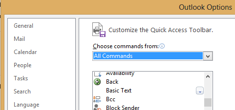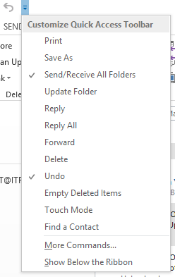 1) Click the drop down for the Quick Access Toolbar, choose More Commands…