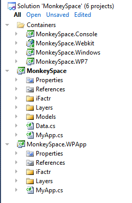 I’ll let you soak up what you’re seeing there. That’s one application, written once, and targeting the Console, Webkit, Windows Desktop, and WP7. In one Visual Studio 2010 solution. In this particular example, it’s an application that pulls data from public web services for the MonkeySpace (formerly MonoSpace) conference on Mono development where not only are some of my colleagues from ITR presenting, but also a very good friend of mine.