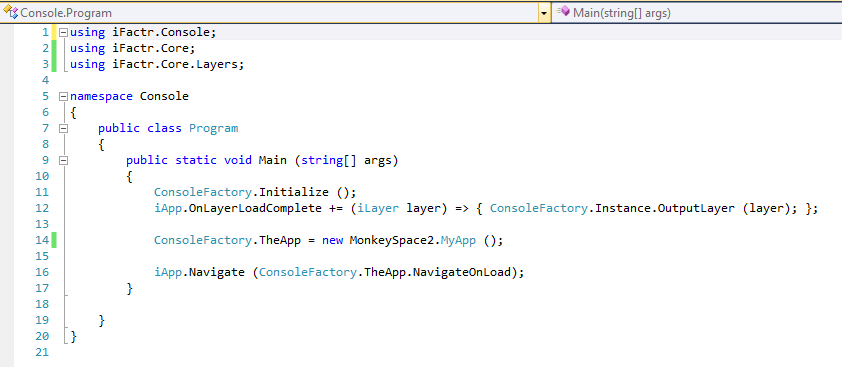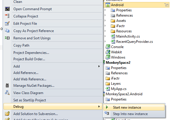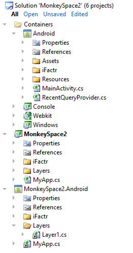 A couple of things have been added now. One, a MonkeySpace2.Android iFactr Application project, and two, an Android iFactr Android Container project. The significance here, if you look closely at the files w/in the Android application (bottom-most project) is that they are linked files in Visual Studio. Their source is the exact same file that is in the MonkeySpace2 application we created to begin with. This means the same code you put in the original source is the exact same code being used by the Android deployment. Again, the only reason this is necessary is because you can’t use the straight-up .Net DLLs on an Android platform, you have to use the Mono variant so it’ll run under Android.