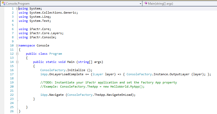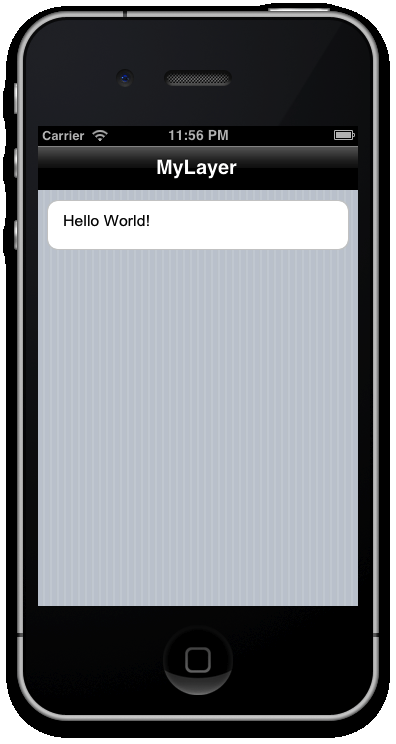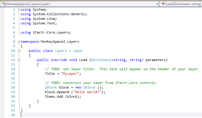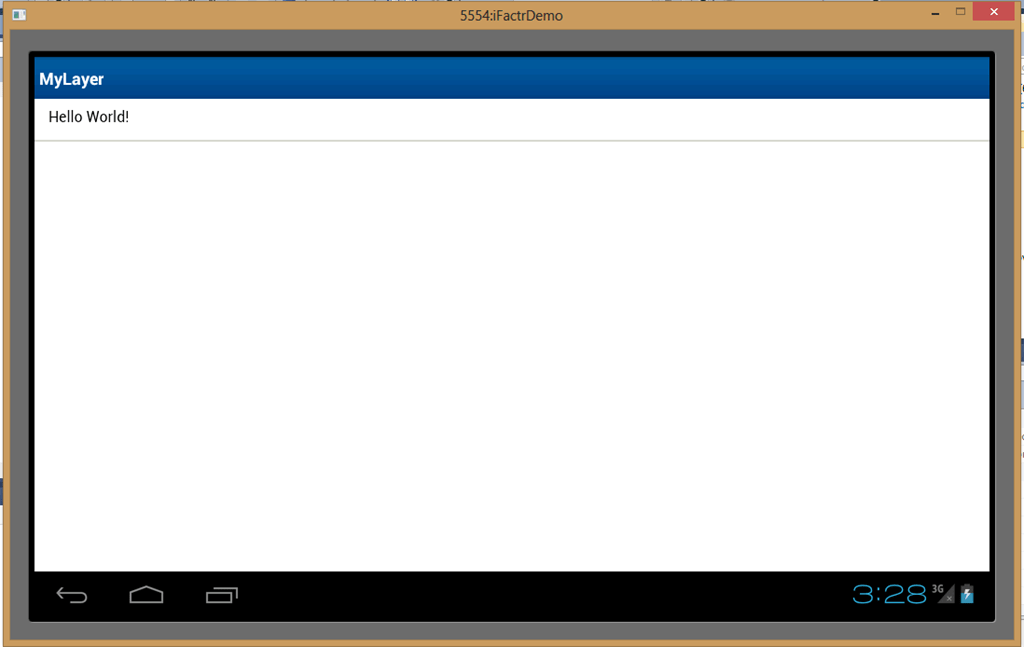 After choosing iFactr Application from the new Project wizard, you’re given this. It’s a fully buildable version of a blank app. The UI construct in iFactr is known as a Layer. So the template Layer we see is, naturally, a Hello World one. Let’s have a gander at the code: