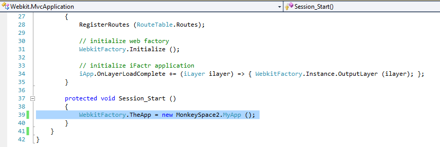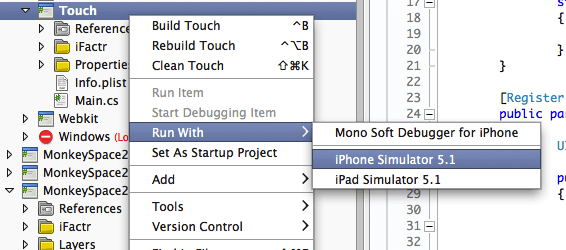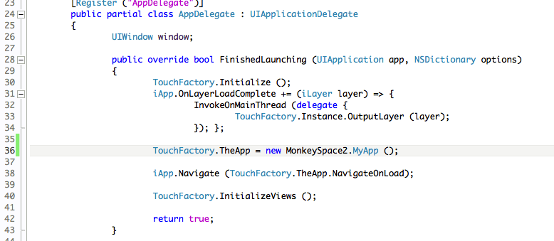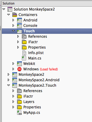 Again, note that we are linking the files from our main MonkeySpace2 application project in to the Touch project, and simply changing the one line in the Touch container to point to the new Touch app after also referencing the app from the container.