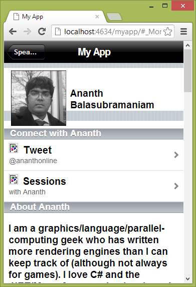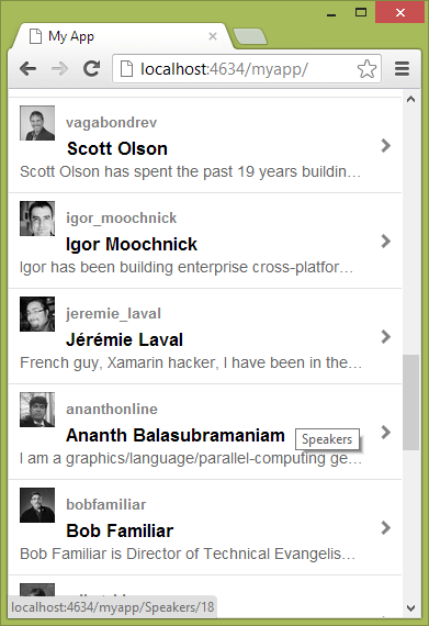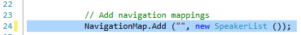 But wait! We also have to add the Speakers/{id} entry to our navigation map so that when the link is clicked from the speakers list, it goes to this page to show further detail!