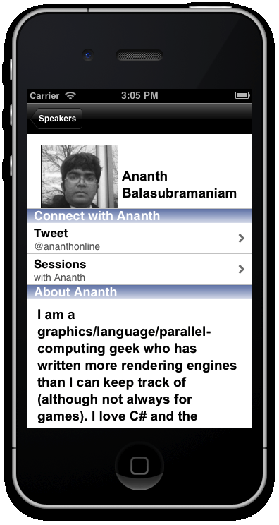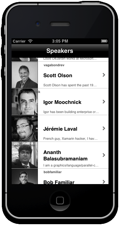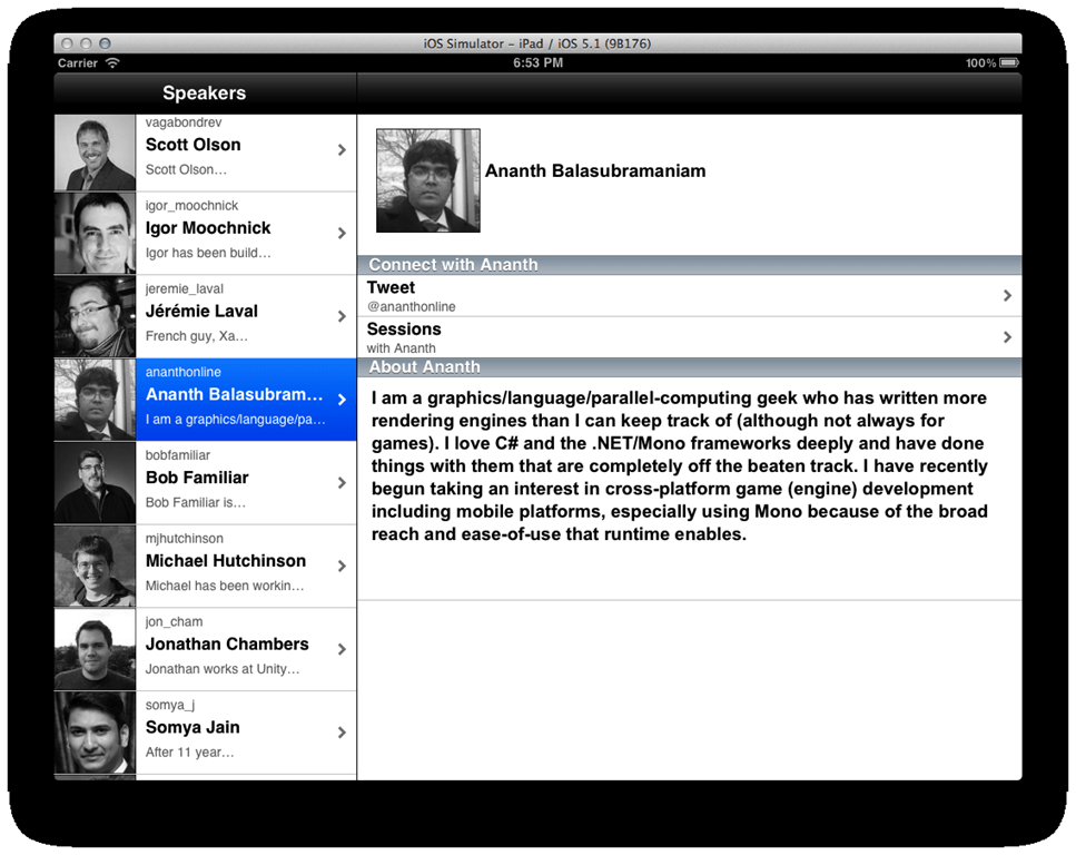 In the Layer, we’re pulling the data from the Speakers collection, looping through each of them, and creating a “ShopItem” for each speaker. This item is most easily described as what you’d see in a listing of products on something like Amazon.com, it contains an icon, main text, sub text, and a headline. So this is a pretty good one to use to list out a quick synopsis of each speaker at MonkeySpace this year.