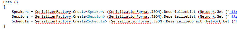 Now obviously I don’t have the Async CTP installed or I’d definitely have chosen to use that here. We want these calls to be synchronous because we don’t want something accessing Data.Speakers before it’s had a chance to call the web service and process the results. But, I’m going to leave that alone for now in the interest of moving this little project along.
