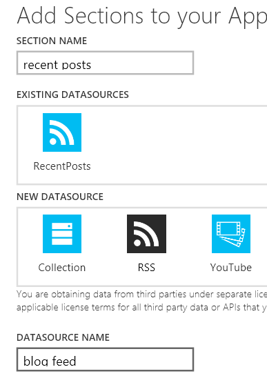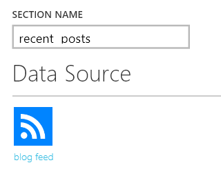 On the next page you’re being prompted to set up the actual content for the “Recent Posts” section you just added. Clicking the data source you defined prior takes you to the setup for the data source: