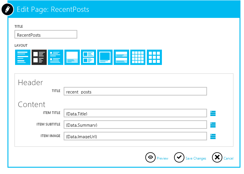 Next, you configure the content. I added two sections, one for “recent posts” and one for post detail.