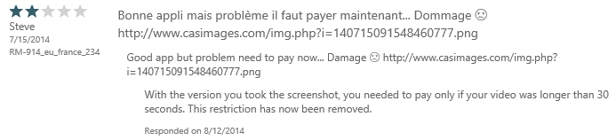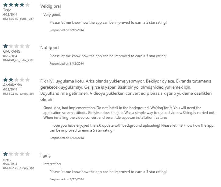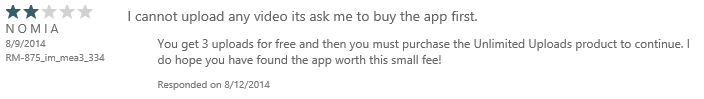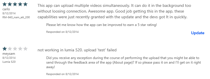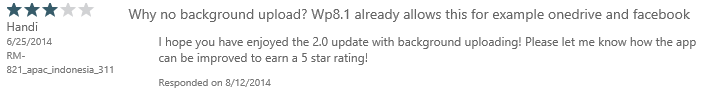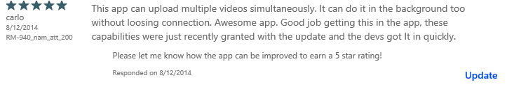 This user’s review was initially 3-stars with no feedback. I asked the question of him and he responded via e-mail that he wanted the ability to do background uploading and multiple videos. When I let him know that the 2.0 version does both those things, he evaluated and updated his review to a 5-star. This is exactly why us developers wanted this ability!