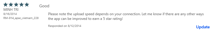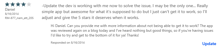 You might be wondering why some of the responses have an ‘Update’ link next to them. This is a feature, though I’ve not found a use for it, of the new system. If a user adjusts their review after you respond to it, you can update your response to their new review. So you’ll see on some of those, the “new” review is 5-star – another shining (ha. pun intended) example of how this system is great for developers – so I can update my feedback for that user should I choose to do so. I kind of which it would keep a record of their preview review(s) though so I can have some context as to my initial response. Perhaps a future implementation.