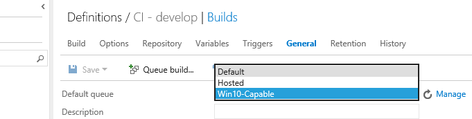 Configure your build definition to use the ‘Default’ queue instead of the ‘Hosted’ one and you’re set! I set up a new queue (during the agent setup above, type in a queue name instead of accepting ‘default’) called “Win10-Capable” for my purposes, which shows up in my Build Definition like so: